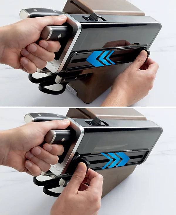 - NeverDull Technology is conveniently built into the storage block for professional sharpening results that will maintain a razor-sharp edge